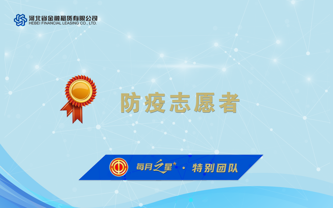 8,河北金租一方面抓業(yè)務(wù)促投放,積極創(chuàng)新業(yè)務(wù)模式和打磨服務(wù)產(chǎn)品,一方面積極落實(shí)區(qū)域防疫政策,以責(zé)任傳遞租賃溫度,為疫情防控貢獻(xiàn)力量。工會(huì)委員會(huì)評(píng)選出本月“每月之星”,請(qǐng)優(yōu)勝團(tuán)隊(duì)和優(yōu)秀員工珍惜榮譽(yù),再立新功,請(qǐng)全體干部員工以先進(jìn)為榜樣,再接再厲,再創(chuàng)佳績(jī)